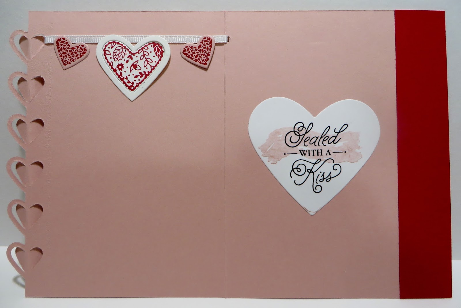For the left inside of my Card: Using SU's new Sealed with Love Stamp Set, I stamped the Hearts in Real Red Ink onto Whisper White and Blushing Bride Cardstock, die cut them out and adhered them to the Ribbon with SU's Mini Glue Dots.