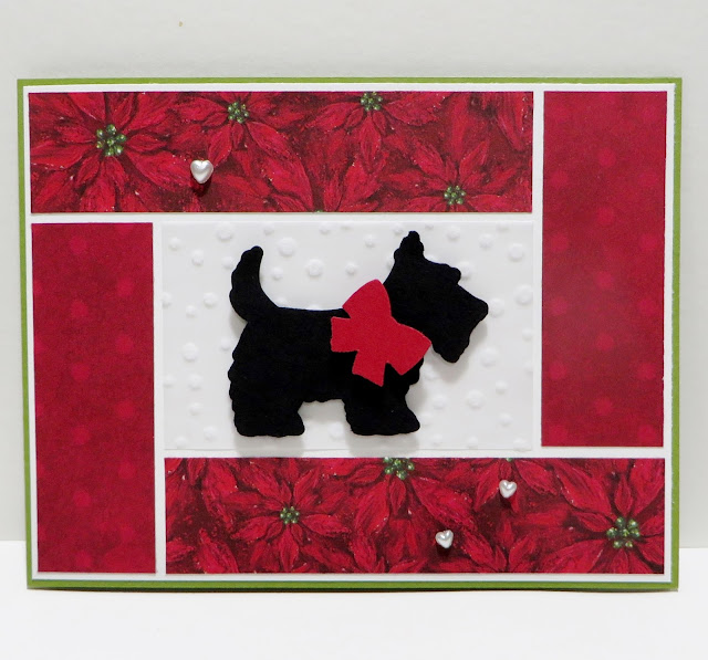 I also made my DSP Strips 1" wide; but, you can make them any width. I used the Boughs of Holly DSP for this Card. I will probably try a 3/4" wide Strip next time so it will make for a larger space in the middle of the Card where the Scottie Dog is placed.